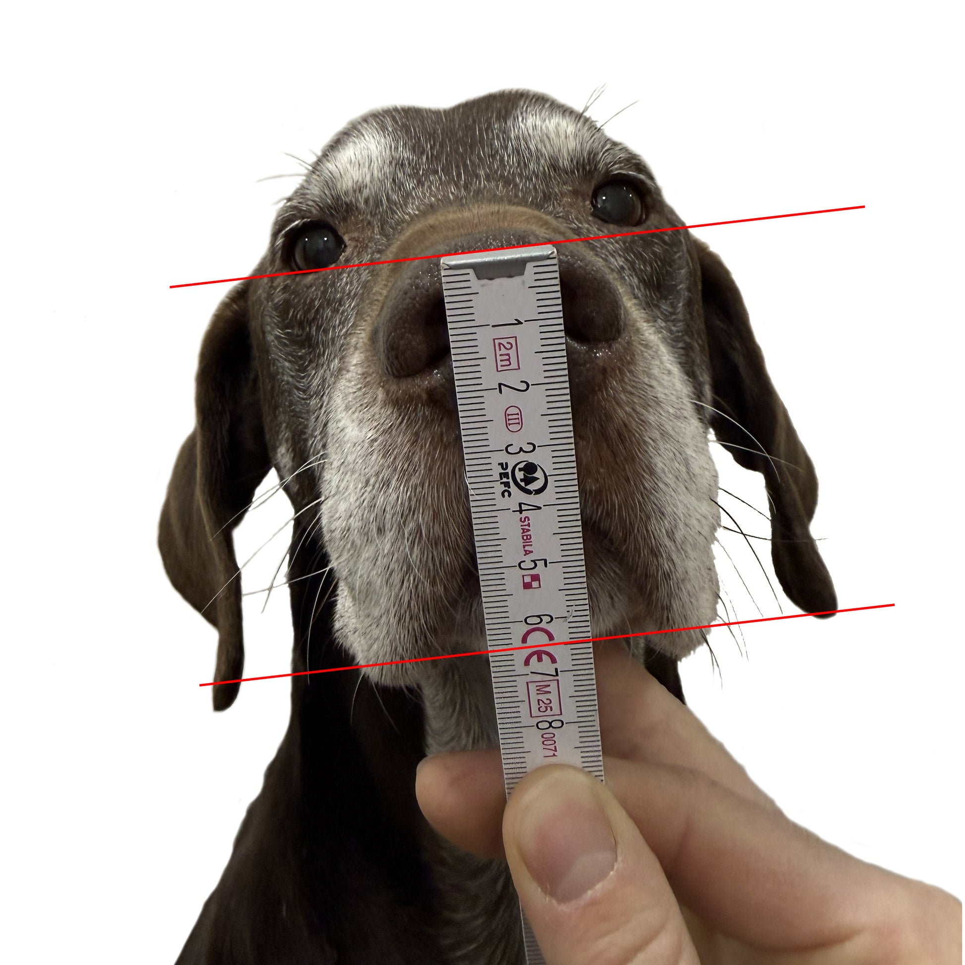 Schnauzenhöhe – Diese Höhe kannst du, wie auf Bild 2 zu sehen ist, messen, indem du von unterhalb der Schnauze bis zur Nasenspitze misst. Beachte dabei, dass das Maul deines Hundes geschlossen ist.